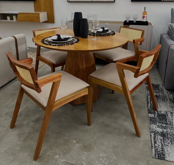 Mesa Alegra 120×80 Cinamomo + 4 Cad. Linho Bege Madeira
