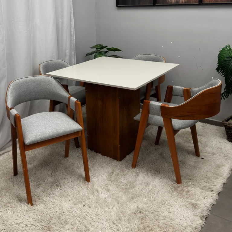 Mesa Pedro 90×90 + 4 Cad. Linho Bege Madeira Maciça