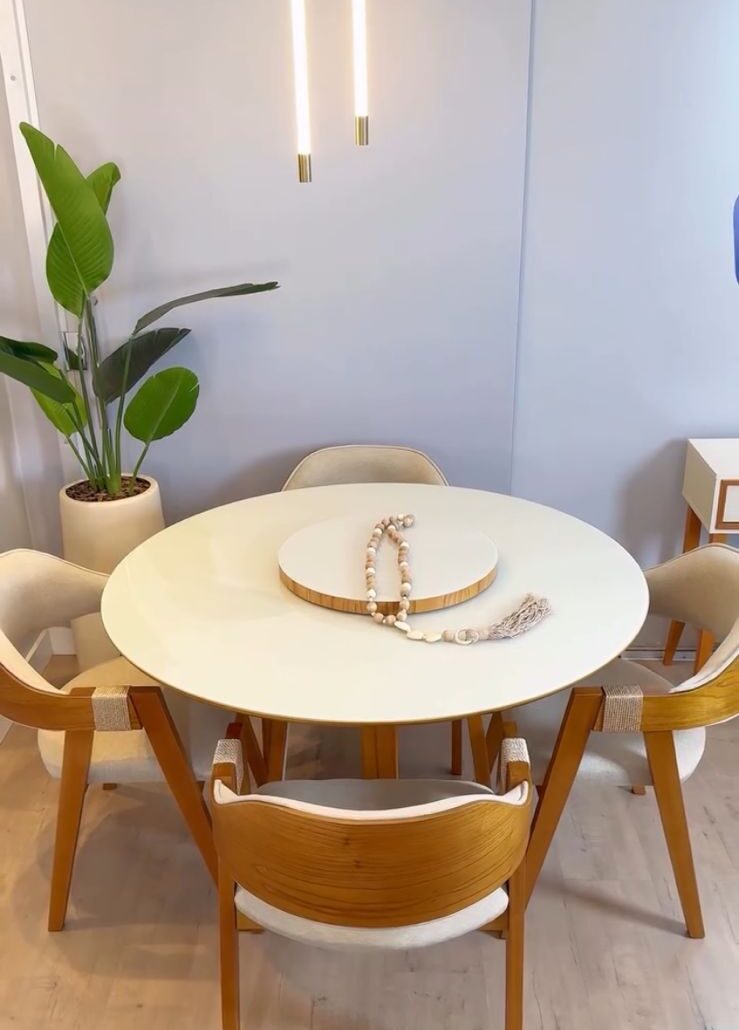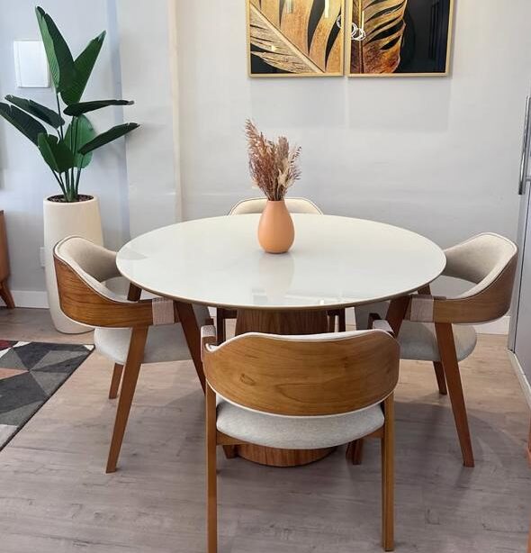 Mesa Moscou 110×110 Redonda C/ 4 Cadeiras Pérola Maciça Tecido linho