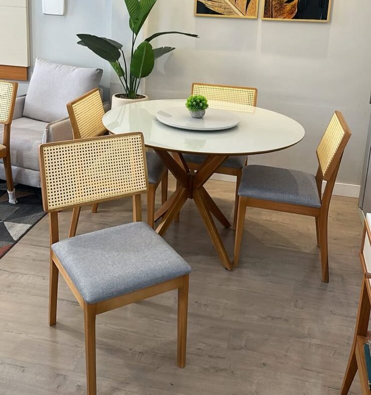 Mesa Simpatia com Vidro Redonda 108×108 C/4Cadeiras Berlim Madeira Maciça Tecido: Linho Cinza