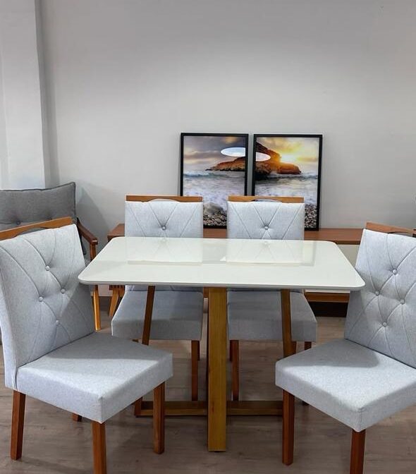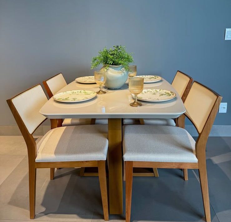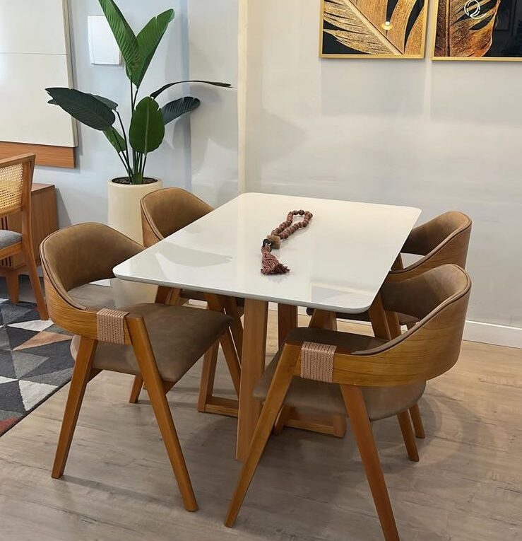 Mesa de Jantar Bali 120x90cm com Vidro e 4 Cadeiras Perola em Corino Madeira