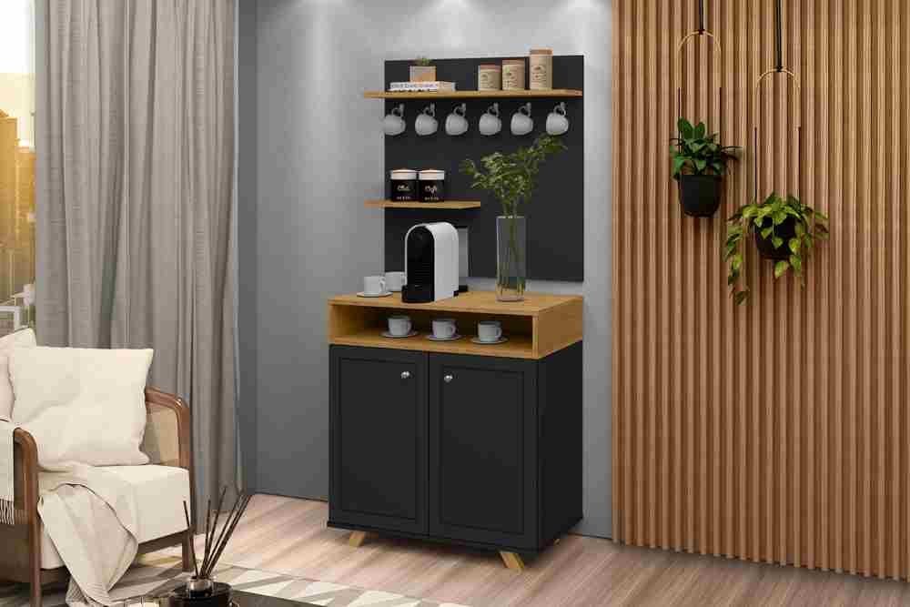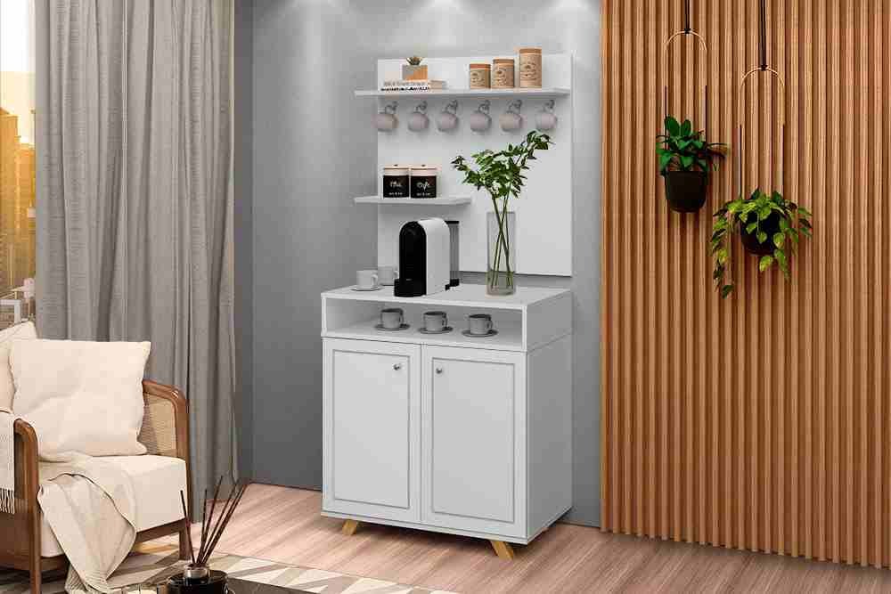 Medidas: Aparador: Alt 0,873m Larg 0,77m Prof 0,38m – Painel/Prateleira: Alt 0,768m Larg 0,77m Prof 0,165m – Estrutura MDF/MDP, 2 Portas de Bater com Dobradiças Metálicas, 3 Nichos, sendo 2 Internos Divididos por 1 Prateleira Interna. Painel com 2 Prateleiras para Objetos e Utensílios Domésticos, Puxadores de Plasticos Cromados e Pés de Madeira Maciça. Acabamento em Pintura UV Brilho.