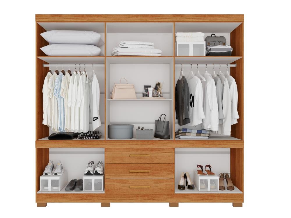 Com um visual elegante e harmônico, o Roupeiro Parma se encaixa facilmente em vários estilos de decoração, tem divisão interna simétrica que oferece praticidade e organização, com corrediças telescópicas nas gavetas, parte interna branca, gavetões externos, puxadores champagne, pés inclusos. Aproveite, você merece!
