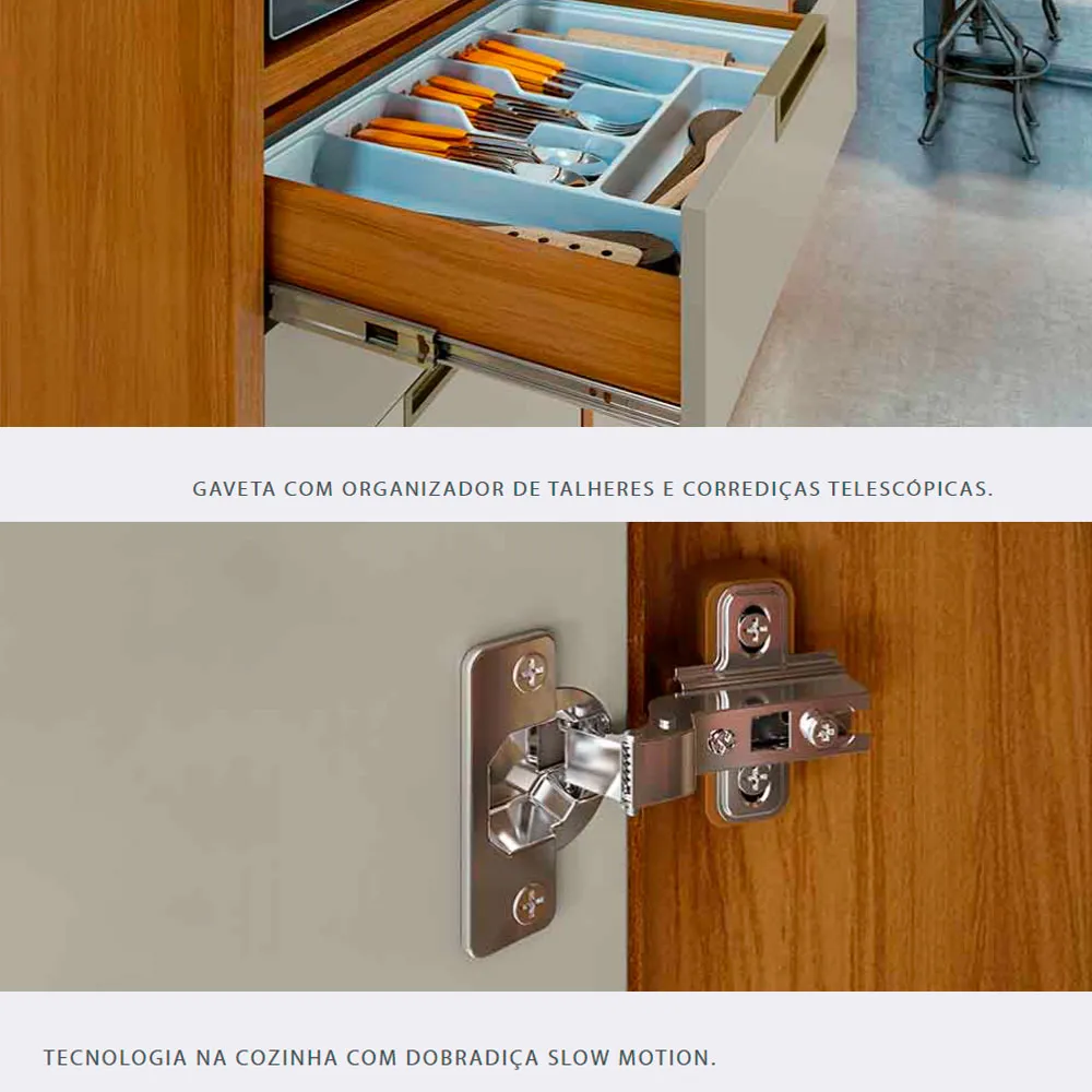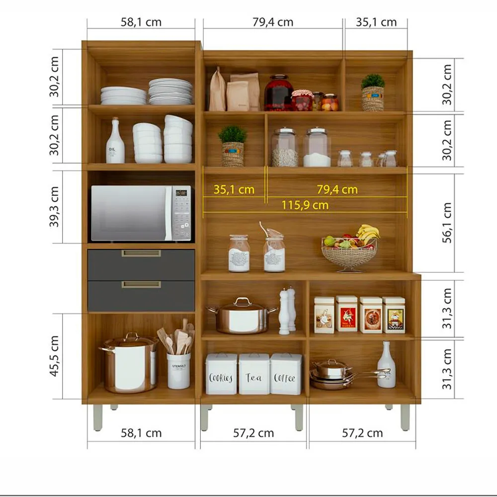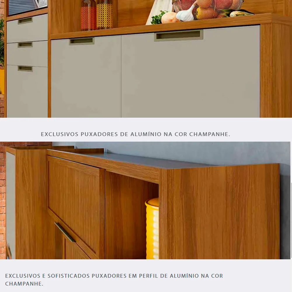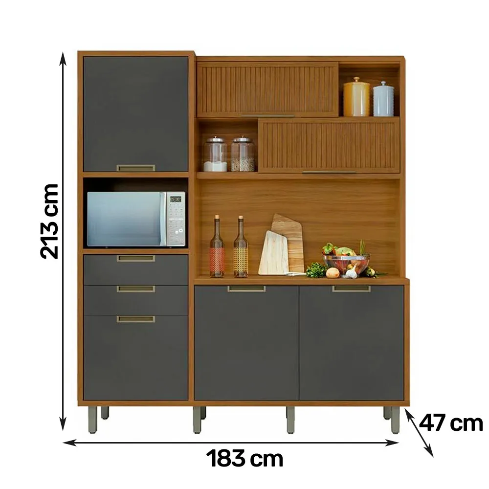 Medidas: Alt 2,12m Larg 1,83 Prof 0,47m, Estrutura 100% MDF em Chapas 15 e 18mm, Tampo 30mm, 4 Portas de Bater com Dobradiças Slow Motion com Freio Anti-Impacto, 2 Portas Basculantes Articuladas com Pistão a Gás e Detalhes Ripados, 3 Nichos, sendo um para Forno 45cm x 39,3cm, 3 Prateleiras Internas, 2 Gavetas com Corrediças Telescópicas com 3 Estágio e Abertura Total, sendo uma com Divisor de Talehres, Fita de Acabamento e Proteção do Totpos 100% Polipropileno, Puxadores de Alumínio na Côr Champanhe e Pés Plásticos Reguláveis.