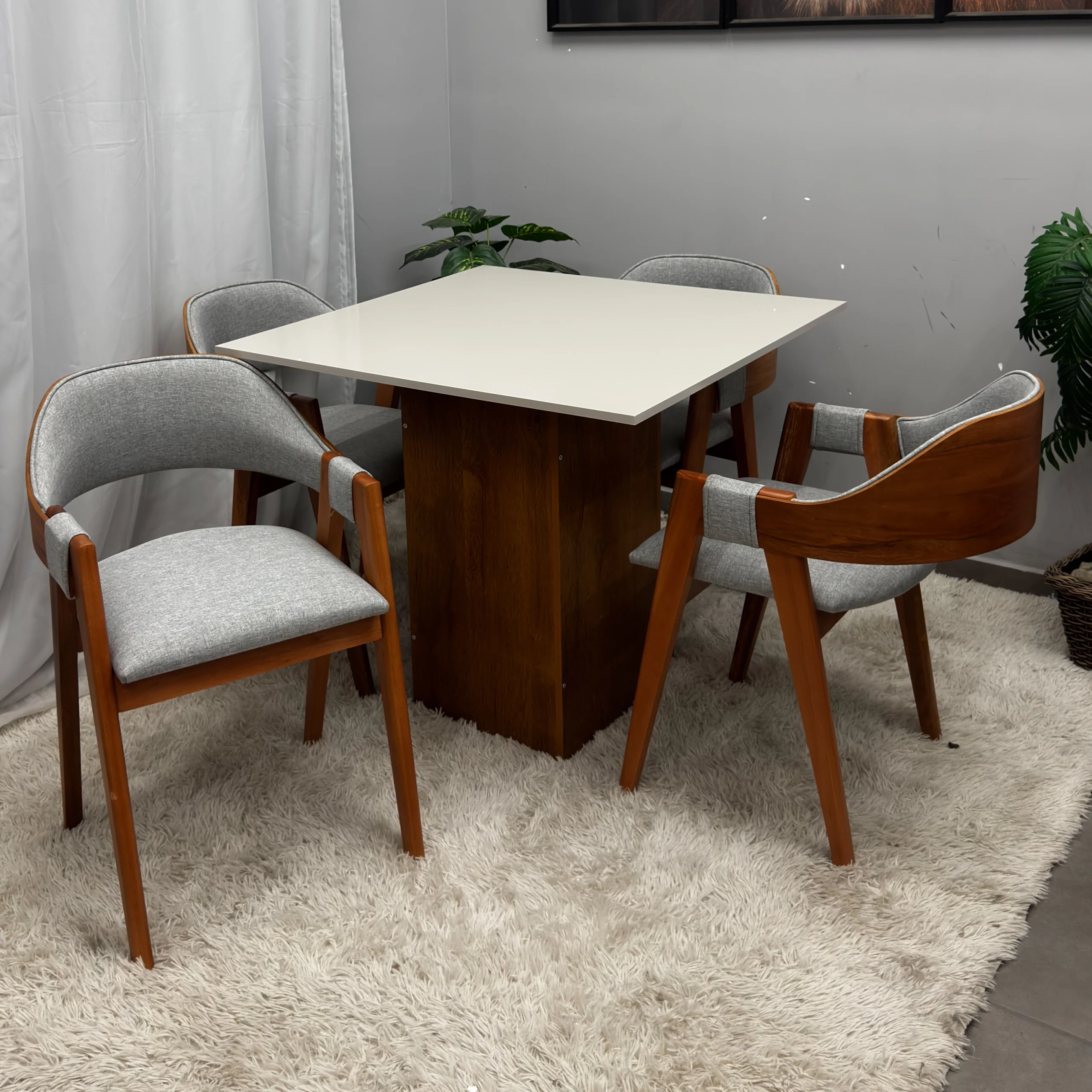 A Mesa de Jantar Dakota 90x90cm SEM Vidro e 4 Cadeiras Perola em Linho Madeira Cel Móveis, com seu formato quadrado e tampo amadeirado sem vidro, é a escolha ideal para quem busca otimizar espaços pequenos sem abrir mão da elegância e do aconchego. O conjunto acompanha 4 cadeiras, que se destacam pelo conforto, conferindo um toque suave e um visual sofisticado ao ambiente. O conjunto une durabilidade e um design clean, sendo perfeito para criar uma sala de jantar moderna, prática e convidativa para as refeições do dia a dia.