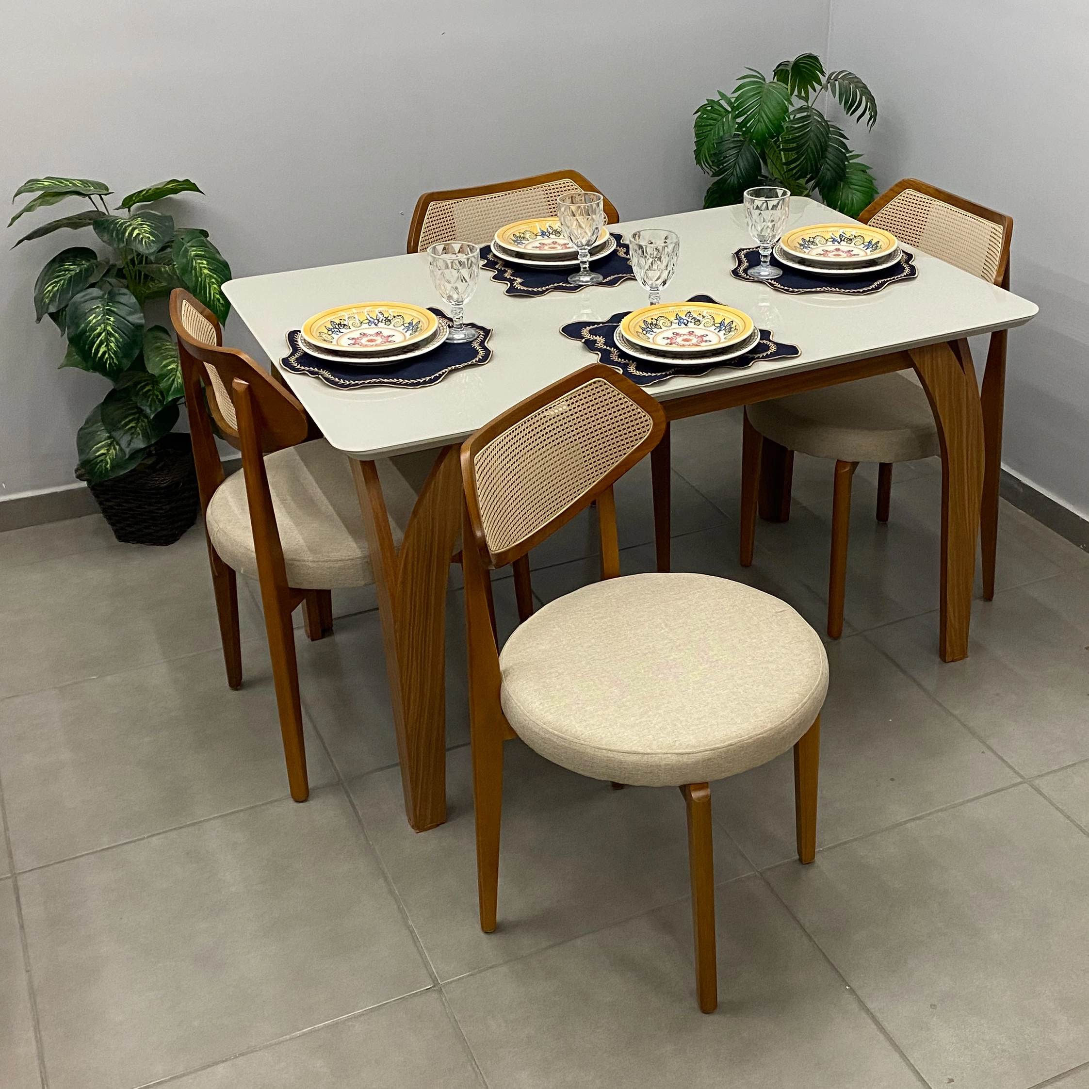 Seja o primeiro a avaliar “Mesa de Jantar Agata 135x90cm com Vidro e 4 Cadeiras Athenas em Linho Madeira”