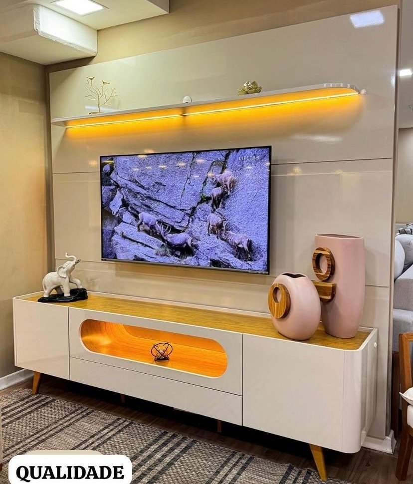 Painel até 85″ Royal 220 Off White + Rack Nobre 210 Off White/Naturale – GELIUS