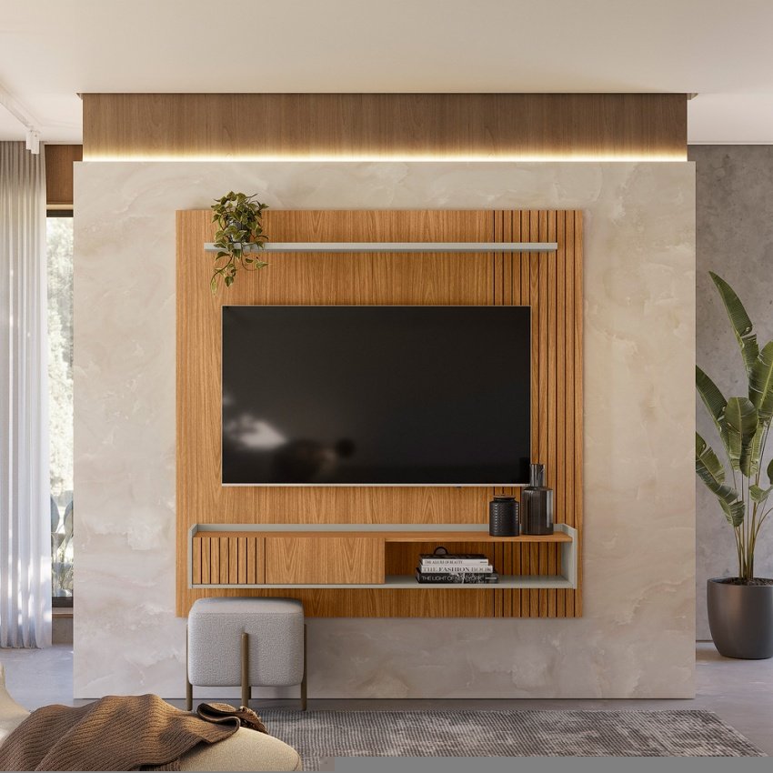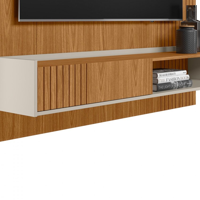 O Painel Home Dublin foi projetado para TVs de até 65 polegadas. Possui uma prateleira superior de 25mm para acomodar objetos decorativos, dois nichos para eletrônicos, uma porta de correr com frisos e puxador embutido. Os detalhes frisados nas laterais proporcionam elegância e estilo para seu ambiente.