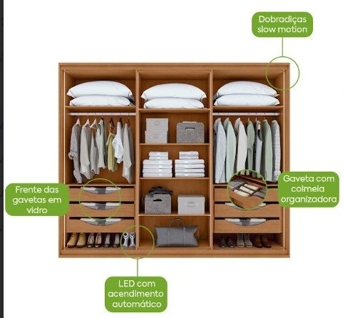 Com acabamento impecável, constituído de materiais nobres, é equipado com portas em vidro fumê e sua estética deslumbrante é reforçada pelos detalhes charmosos de seus cantos arredondados – uma das maiores tendências do setor moveleiro para 2023 e 2024.O led localizado nas portas com acendimento automático na abertura do roupeiro é uma inovação, que serve tanto para o embelezamento do móvel como para ajudar a encontrar os objetos com mais facilidade, mesmo sem abrir o guarda-roupa. Isso também ocorre com as gavetas em vidro, extremamente refinadas e exuberantes!A implementação da dobradiça Slow Motion, que é um amortecedor incorporado para o fechamento mais suave das portas, atua sem permitir que exista um grande impacto nas peças, o que é uma das grandes vantagens de escolher este roupeiro, pois estes cuidados com a integridade das portas significam alcançar mais segurança, qualidade e durabilidade.Tenha uma decoração mais leve, radiante e solar!