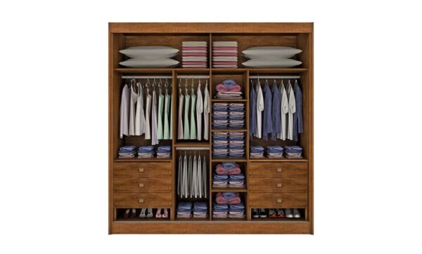 Medidas: Alt: 2,30m Larg: 2,73m Prof: 0,62m, Estrutura 100% MDF em chapas de 15mm e 25mm, 03 Portas de Correr com Roldanas com Molas, sendo uma com Espelhocom Película de Segurança e as Portas Laterais com Detalhe Ripado, 6 Gavetas com Corrediças Telescópicas e Abertura Total (40cm), 10 Prateleiras Internas, 3 Cabideiros de Alumínio, sendo um Calceiro, todos com Suportes Metálicos.