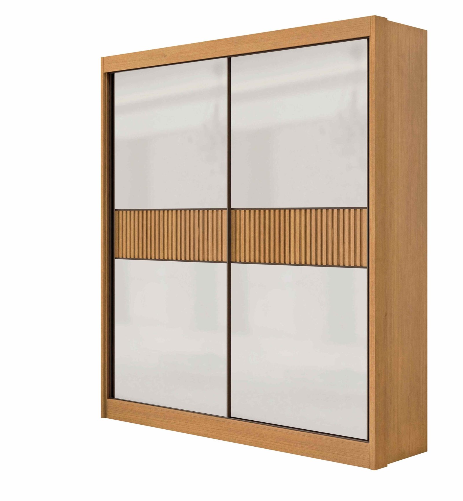 Roupeiro Santorini, Côr Cinamomo/Off White Ripado Flex, da D’Doro, Medidas: Alt 2,30m Larg 1,85m Prof 0,62m – Estrutura 100%¨MDF 15mm e 25mm, 2 Portas Deslizaantes com Roldanas com Molas e Detalhe Ripado, 3 Gavetas com Corrediças Telescópicas e Abertura Total (40cm), Puxadores de Alumínio, 2 Cabideiros com Suporte de Alumínio, 8 Nichos Divididos por 9 Prateleiras para Roupas e Objetos Pessoais, 1 Sapateira e Acabamento em Pintura UV Alto Brilho.